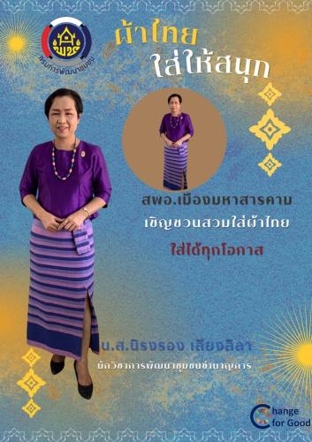 สำนักงานพัฒนาชุมชน อำเภอเมืองมหาสารคาม ประชาสัมพันธ์ เชิญชวนส่วนราชการ บุคลากรภาครัฐ รัฐวิสาหกิจ ภาคเอกชน และประชาชนทั่วไปให้สวมใส่ผ้าไทยตามพระดำริ “โครงการผ้าไทยใส่ให้สนุก” สืบสาน อนุรักษ์ศิลป์ ผ้าถิ่นไทย ดำรงไว้ในแผ่นดิน